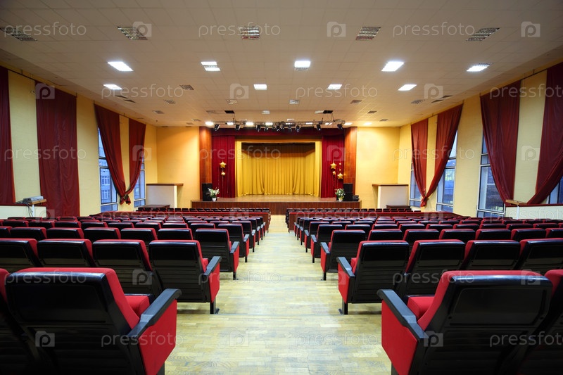 Концертный зал и пустая сцена, многие ряды красных сидений и сцена