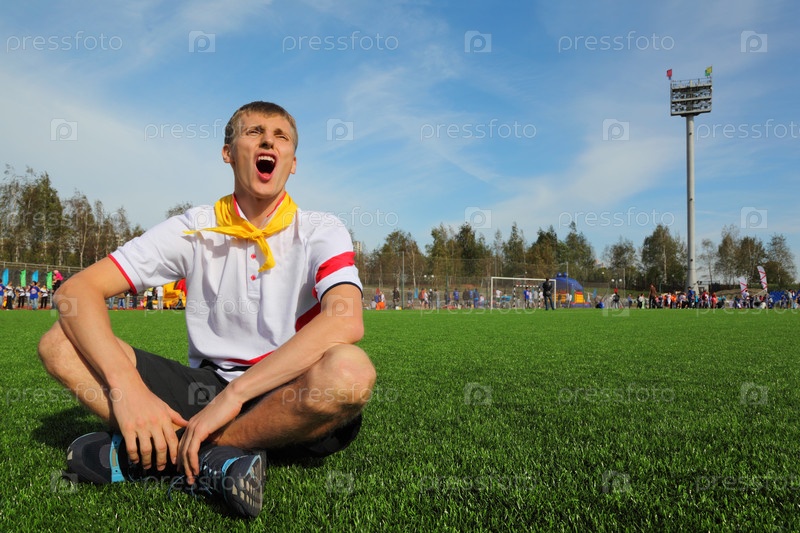 Молодой мальчик сидит скрещенными ногами на зеленом поле