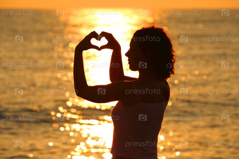 Силуэтированная женщина формирует форму сердца руками