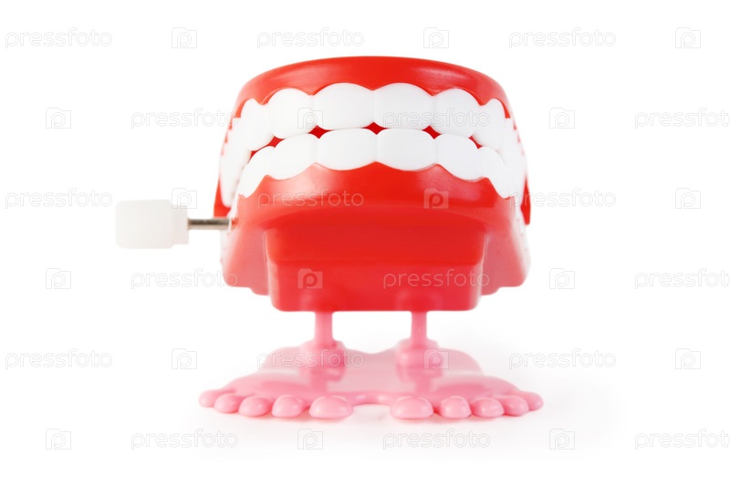 Игрушечная часовая челюсть с белыми зубами на розовых ногах на ярких белых