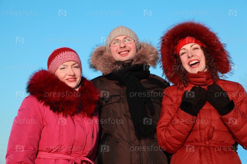 Мужчина и две женщины стоят на открытом воздухе зимой, трое друзей мужчины
