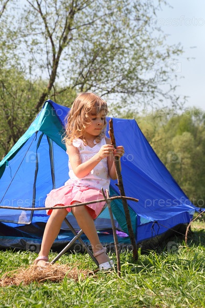 Маленькая девочка сидит на лагерном кресле рядом с голубой палаткой