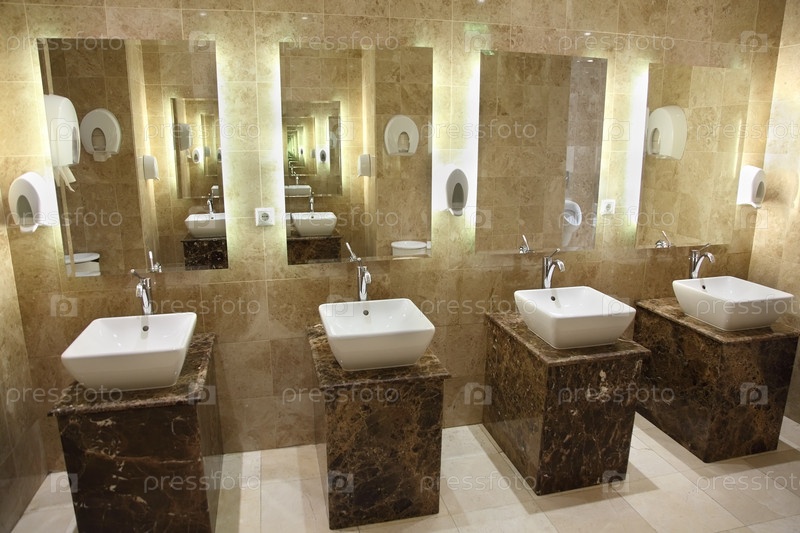 Современная ванная комната с четырьмя мраморными раковинами и зеркалами