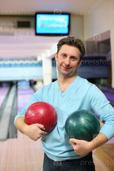 Мужчина держит два мяча для боулинга в полосе проезда