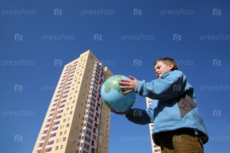 Маленький мальчик в синей куртке держит воздушный шар в форме земного шара,