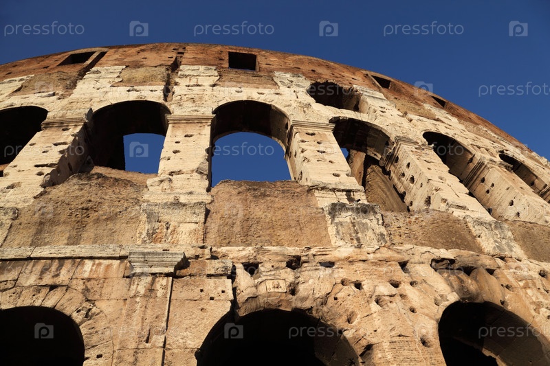 Древний римский амфитеатр стоит высоко на ясном голубом небе