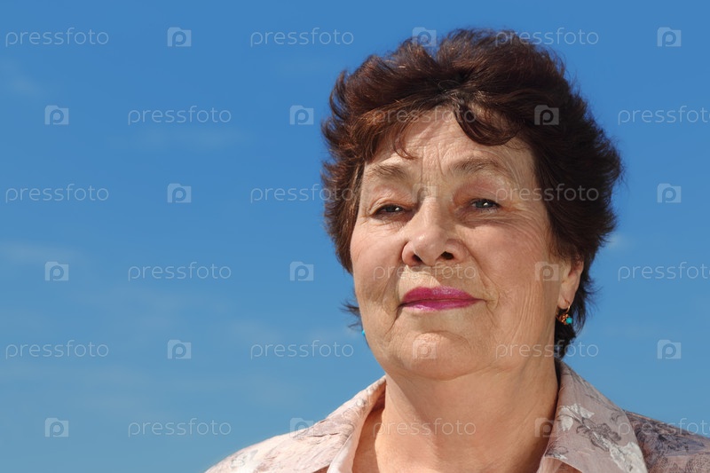 Спокойная пожилая женщина улыбается на ярко-синем небе