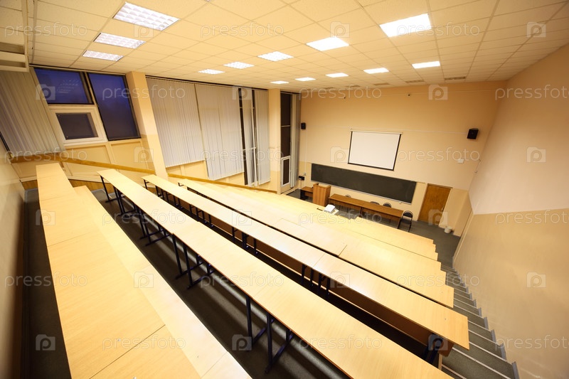 Большой класс, университетский лекционный зал; большая доска, деревянные столы и скамейки