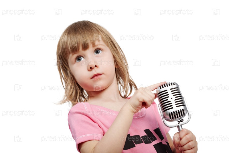 Маленькая девочка в розовом с микрофоном держит указательный палец на вершине