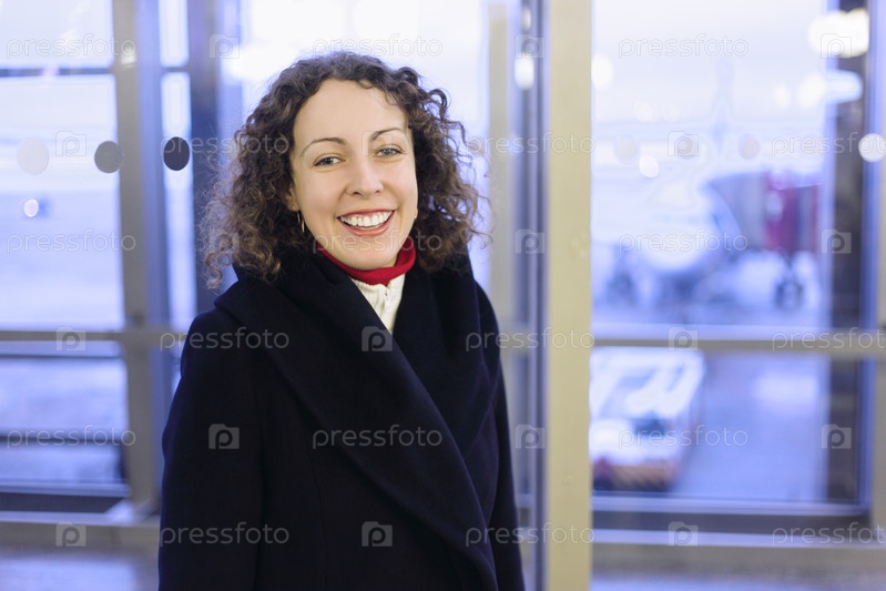 Юная улыбающаяся женщина стоит у окон аэропорта, airpl