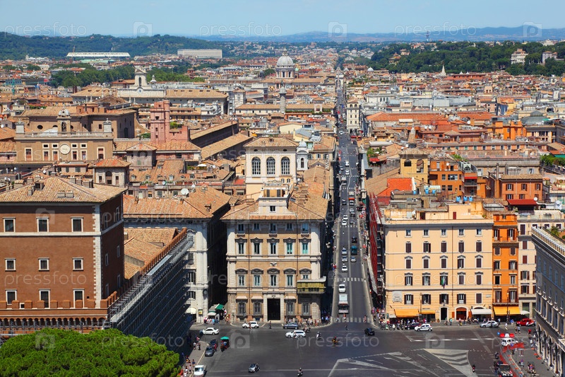 Панорама Рима с алтаря Отечества в летний день в Риме, Италия