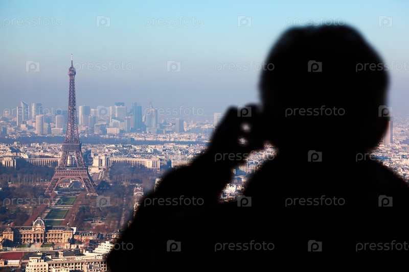 Человек фотографирует панораму Парижа с Эйфелевой башней, la Défense at