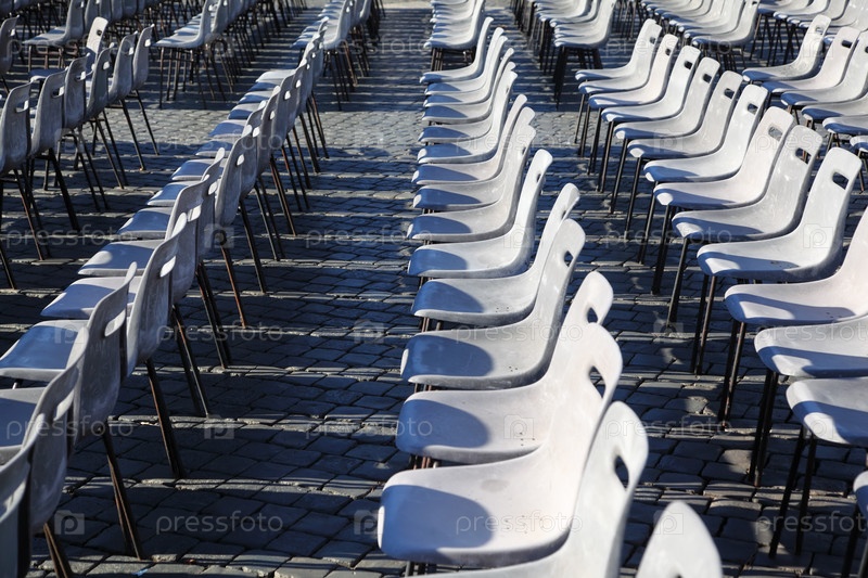 Многие ряды серых, пластиковых стульев