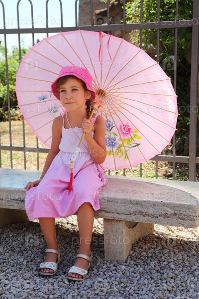 Красивая девочка в розовом сарафане сидит на скамейке под розовым