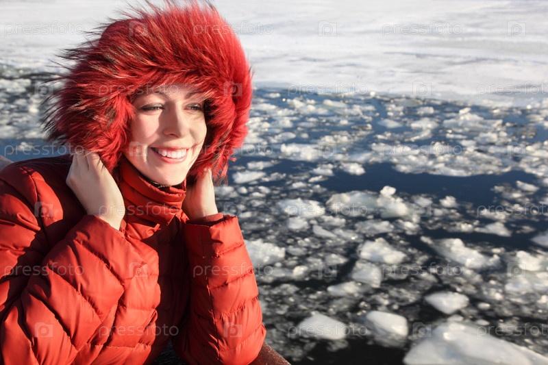 Красивая молодая женщина в красной куртке, улыбающаяся и стоящая рядом с рекой