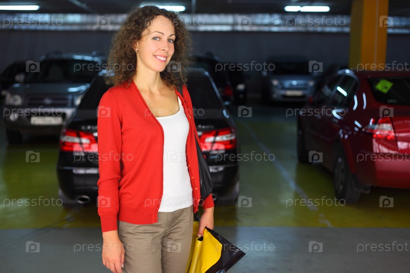 Красивая молодая женщина в красном кардигане с посылками, стоящими внутри