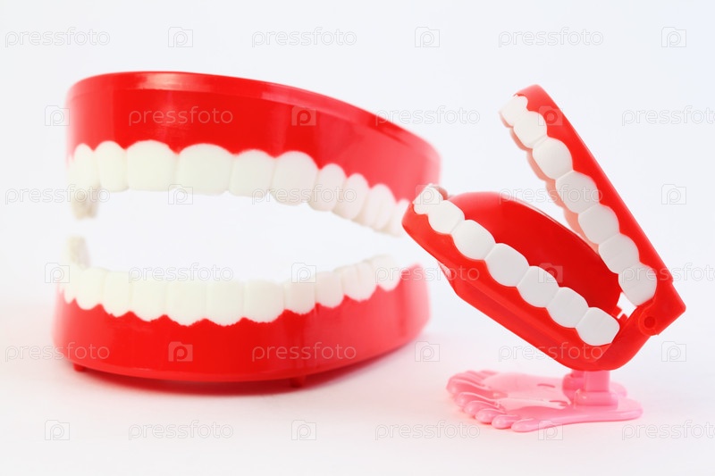 Небольшая игрушечная челюсть с ногами и механизмом глотания большой челюсти на белом