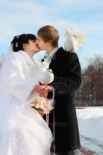 Красивая невеста и жених целуют и держат белого голубя на зимней природе;