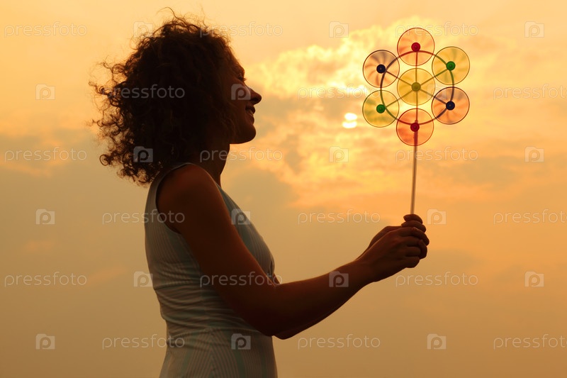 Женщина держит красочное кольцевое колесо против золотистого заката солнца