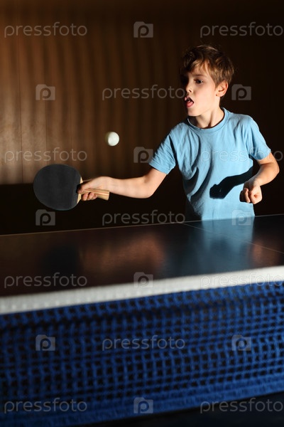 Мальчик играет в пинг-понг; сосредоточенное лицо; мальчик вытянул свой