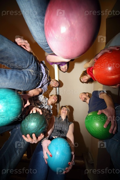 Девушки и молодежь стоят в кругу, а все держат мяч для боулинга