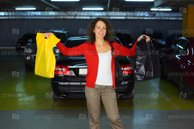 Красивая счастливая женщина с покупками стоит на подземной парковке