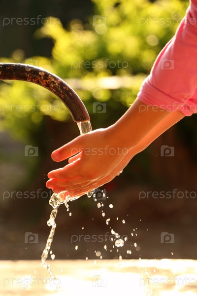 Руки детей. маленькая девочка моет руки чистой водой из крана,