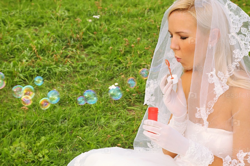 Красивая молодая невеста в белом платье сидит на зеленой траве и