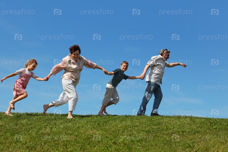 Внуков и их бабушек и дедушек, бегущих по лужайке и держащихся за своих внуков