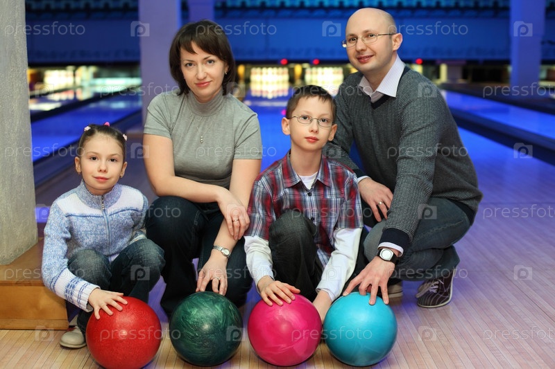Семья из четырех человек приседает в клубе для боулинга и держит
