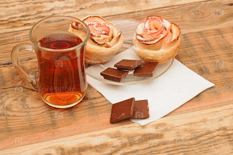 Яблочные кексы с цветами и чашка чая на деревянном столе