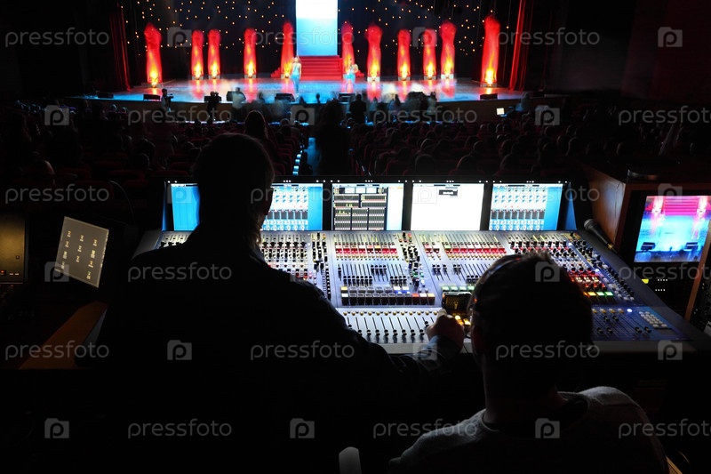 Два человека работают с большой аудиомикшерной консолью