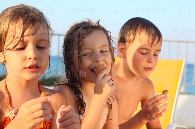 Маленький брат и две сестры в купальниках на пляже, едят мороженое