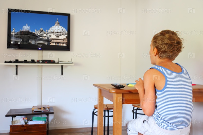 Маленький мальчик в полосатой рубашке сидит за столом и смотрит телевизор, фото