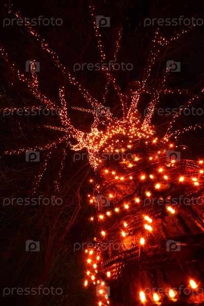 Ствол и небрежные ветви деревьев с множеством декоративных красных огней на
