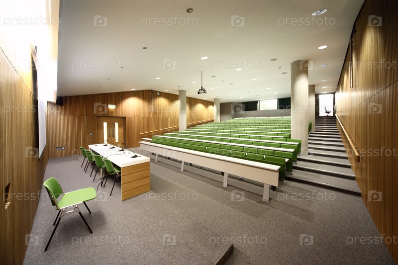 Современный лекционный зал с зелеными местами для сидения и деревянными стенами