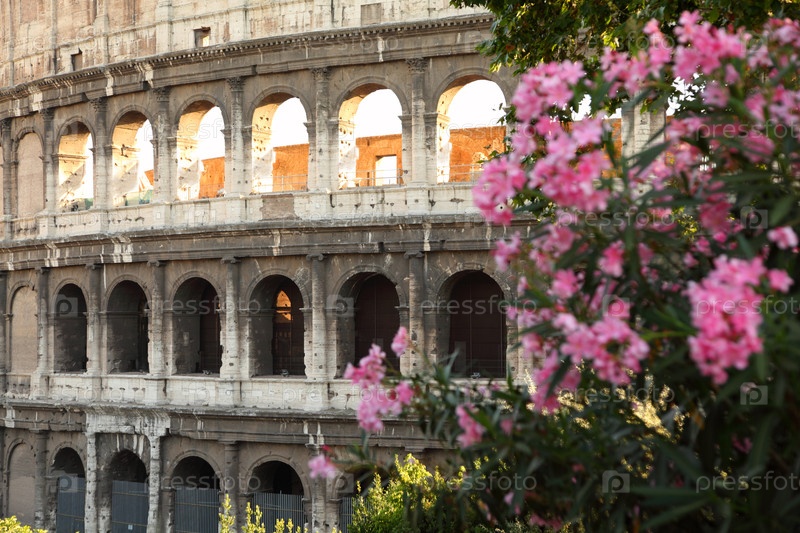 Розовые цветы распускаются рядом с древним римским Колизеем
