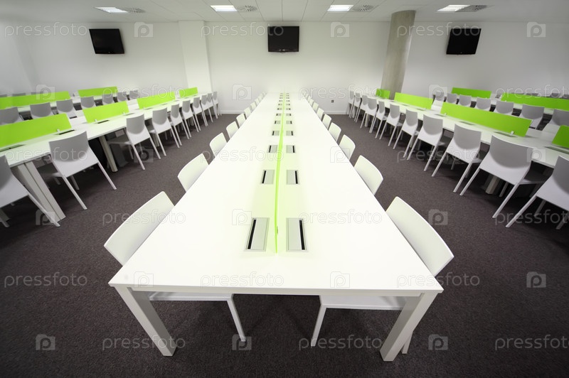Большая яркая обеденная комната с белыми столами и стульями, тренировка