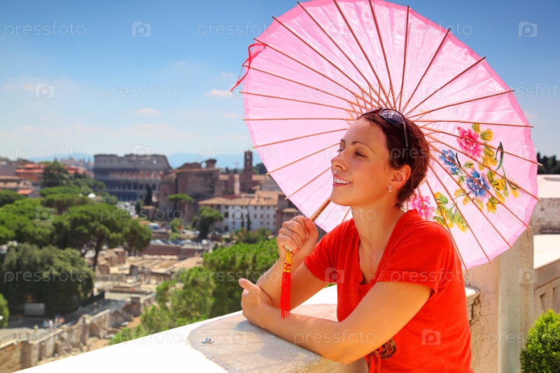Молодая женщина с розовым зонтиком смотрит на Рим из алтаря прекрасной