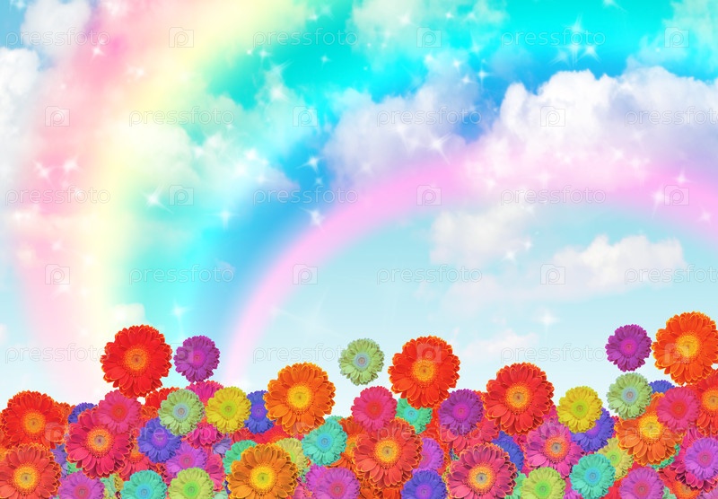 Вибрирующие цветы распускаются под радужным небом