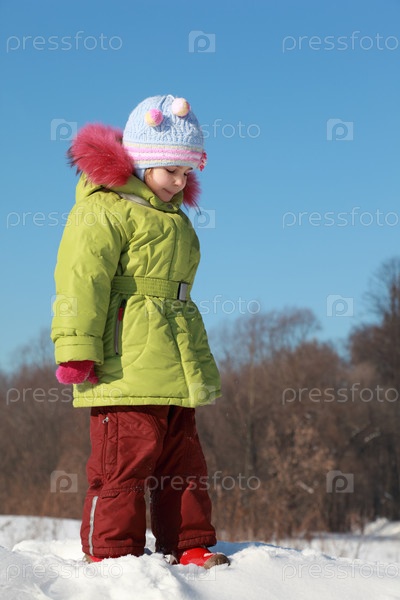 Маленькая девочка в зеленой куртке стоит на снегу зимой и