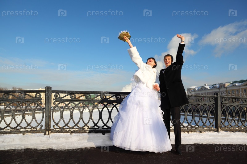 Счастливые жених и невеста кричат и машут руками зимой
