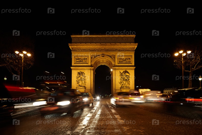 Триумфальная арка на площади SDG ночью. дорога не сфокусирована. размытые световые следы автомобилей