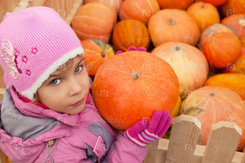 Маленький ребенок держит большую оранжевую тыкву