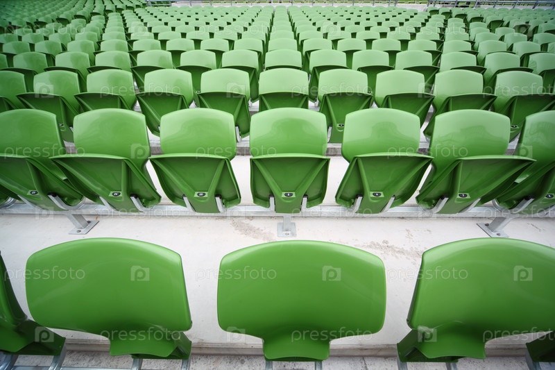 Ряд сложенных, зеленых пластиковых сидений на очень большом пустом стадионе