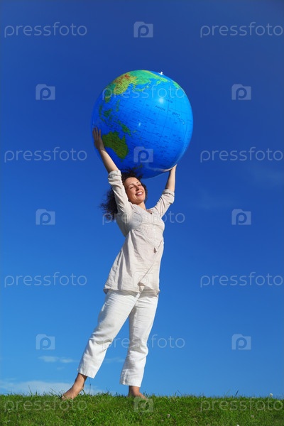 Молодая женщина стоит на лужайке и держит над собой надувный шар