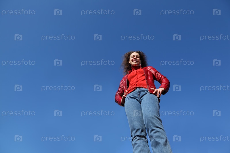 Молодая женщина стоит перед чистым голубым небом
