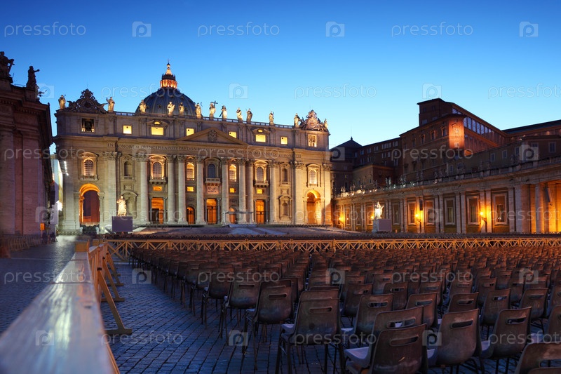 Ватиканский музей в базилике Святого Петра и ряды серых стульев вечером в Риме, Италия