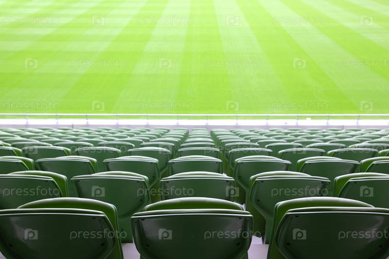 Ряд зеленых сидений на стадионе обращен к живому травяному полю