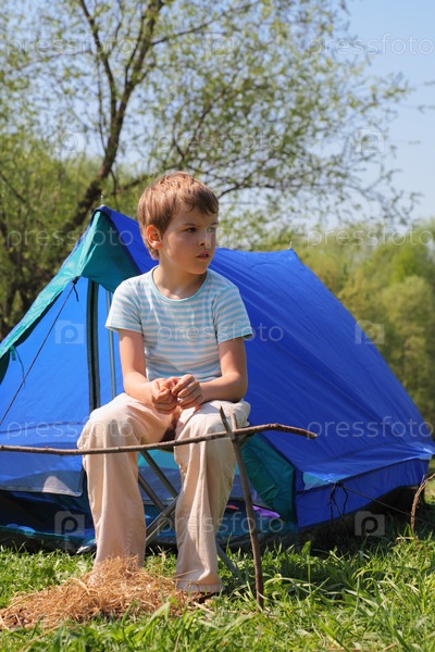 Молодой мальчик сидит снаружи голубой палатки